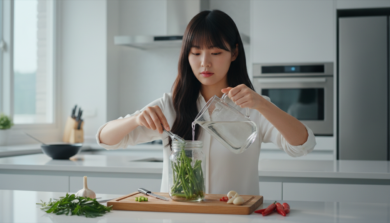 3단계 - 병 담기: 소독한 유리병에 두릅을 차곡차곡 담고, 절임물이 어느 정도 식으면(60~70도 정도) 두릅이 잠길 만큼 붓습니다. 완전히 식힌 뒤 뚜껑을 닫아 냉장 보관합니다.